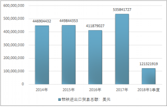 2016年我國鈮鐵進出口貿易總額411879027美元,2017年進出口貿易總額535841727美元;2018年1季度進出口貿易總額121321919美元。