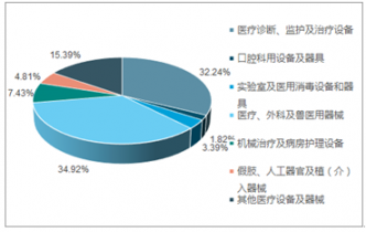 從近三年我國醫(yī)療器械市場的產(chǎn)品結構來看,醫(yī)療、外科及獸醫(yī)用器械占據(jù)最大的市場份額,2017年占比為34.92%,其次是醫(yī)療診斷、監(jiān)護及治療設備,占據(jù)32.2%左右的市場份額。