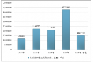 2016年我國玄武巖纖維及其制品進出口貿易總量2128505千克 ,2017年進出口貿易總量4310542千克 ;2019年1季度進出口貿易總量1562640千克 。