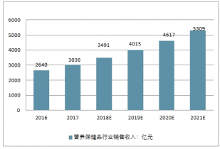 2016-2021年中國營養(yǎng)保健品行業(yè)銷售收入及預(yù)測(單位:億元)