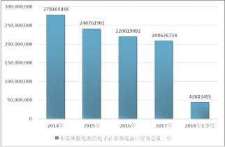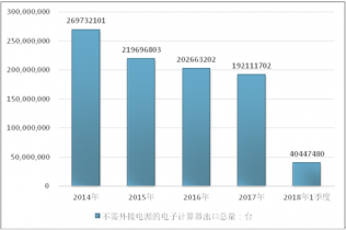2016年我國不需外接電源的電子計算器進出口貿(mào)易總量220019092臺 ,2017年進出口貿(mào)易總量208626734臺 ;2018年1季度進出口貿(mào)易總量43883455臺 。