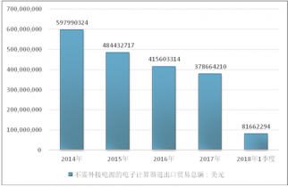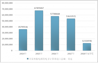 2016年我國不需外接電源的電子計算器進出口貿易總額415603314美元,2017年進出口貿易總額378664210美元;2018年1季度進出口貿易總額81662294美元。