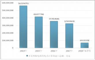 2016年我國不需外接電源的電子計算器出口總額357814646美元,2017年出口總額325030638美元;2018年1季度出口總額69335358美元。