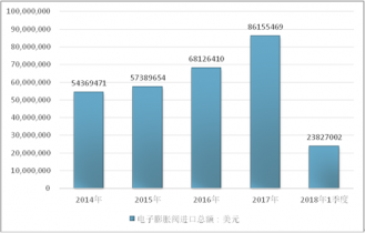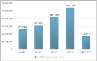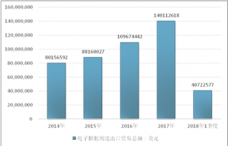 2016年我國電子膨脹閥進出口貿易總額109674442美元,2017年進出口貿易總額140112618美元;2018年1季度進出口貿易總額40722577美元。