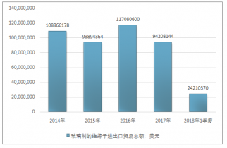 2016年我國玻璃制的絕緣子進出口貿易總額117080600美元,2017年進出口貿易總額94208144美元;2018年1季度進出口貿易總額24210370美元。