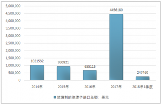 2016年我國玻璃制的絕緣子進口總額655115美元,2017年進口總額4456180美元;2018年1季度進口總額247460美元。