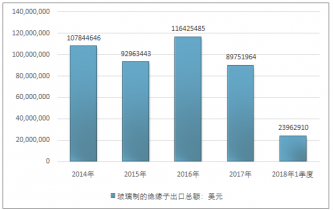 2016年我國玻璃制的絕緣子出口總額116425485美元,2017年出口總額89751964美元;2018年1季度出口總額23962910美元。