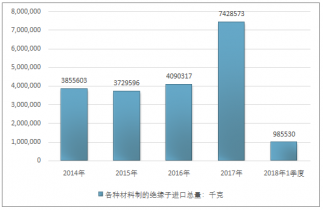 2016年我國(guó)各種材料制的絕緣子進(jìn)口總量4090317千克,2017年進(jìn)口總量7428573千克;2018年1季度進(jìn)口總量985530千克。