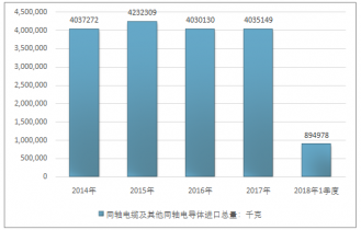 2016年我國同軸電纜及其他同軸電導(dǎo)體進(jìn)口總量4030130千克,2017年進(jìn)口總量4035149千克;2018年1季度進(jìn)口總量894978千克。