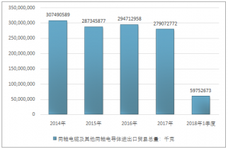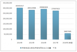 2016年我國同軸電纜及其他同軸電導(dǎo)體出口總量290682828千克,2017年出口總量275037623千克;2018年1季度出口總量58857695千克。