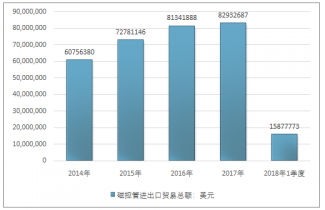 2016年我國磁控管進出口貿易總額81341888美元,2017年進出口貿易總額82932687美元;2018年1季度進出口貿易總額15877773美元。