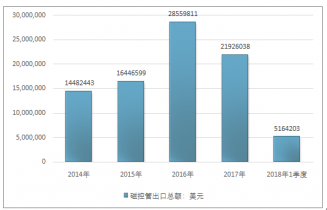 2016年我國磁控管出口總額28559811美元,2017年出口總額21926038美元;2018年1季度出口總額5164203美元。
