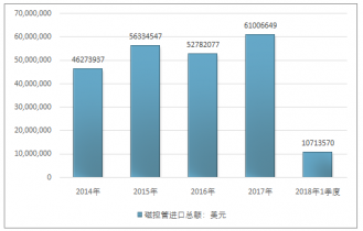 2016年我國磁控管進口總額52782077美元,2017年進口總額61006649美元;2018年1季度進口總額10713570美元。