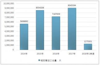 2016年我國磁控管進口總量7187659只,2017年進口總量9045594只;2018年1季度進口總量1275501只。