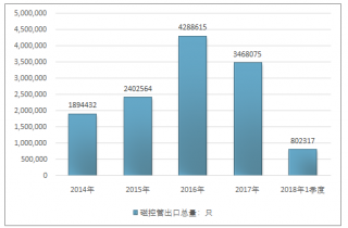 2016年我國磁控管出口總量4288615只,2017年出口總量3468075只;2018年1季度出口總量802317只。