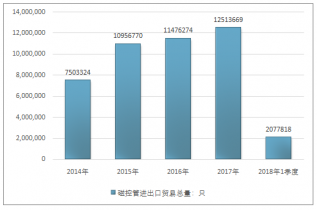 2016年我國磁控管進出口貿易總量11476274只,2017年進出口貿易總量12513669只;2018年1季度進出口貿易總量2077818只。