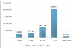 2016年我國弧光燈進(jìn)出口貿(mào)易總額74128204美元,2017年進(jìn)出口貿(mào)易總額207823906美元;2018年1季度進(jìn)出口貿(mào)易總額6722546美元。