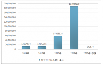 2016年我國弧光燈出口總額57325528美元,2017年出口總額187084051美元;2018年1季度出口總額140874美元。