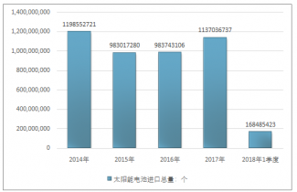 2016年我國太陽能電池進出口貿易總量1757315261個,2017年進出口貿易總量2085599931個;2018年1季度進出口貿易總量418851571個。