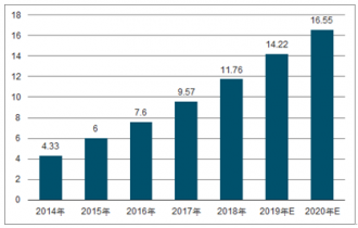 2014-2020年中國(guó)高端裝備制造產(chǎn)業(yè)銷售收入預(yù)測(cè)(萬(wàn)億元)