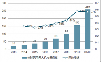 2015年,全球民用無人機市場規模為36億美元,同比增長33%。據中國產業信息網預測,到2020年全球民用無人機市場規模預計可達259億美元,年均復合增長率為42%。