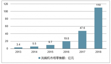 2016年中國洗碗機市場零售額為19.8億元,同比增104.8%。進入2017年,中國洗碗機產(chǎn)品銷量增幅迎來爆發(fā)式增長,截至2017年8月,洗碗機市場零售額已達24.2億元,超去年全年零售額總量,同比增長134.7%。2017洗碗機產(chǎn)業(yè)全年零售額達到了47.6億元,同比增長140%。預(yù)計2019年中國洗碗機行業(yè)零售額將突破100億元大關(guān),達到了110.2億元。