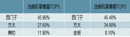 2019年洗碗機零售額、零售量TOP3