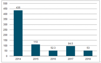 當(dāng)前全球海洋工程裝備建造市場(chǎng)尚未走出低谷,過剩的裝備供應(yīng)導(dǎo)致新訂單缺乏孕生基礎(chǔ),新造需求極為有限。2018年上半年,全球累計(jì)成交各類海洋工程裝備36艘(座)、成交額53億美元,同比下滑約23%。