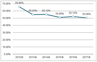 2012-2017年導航、氣象及海洋專用儀器制造行業資產負債率變化(%)