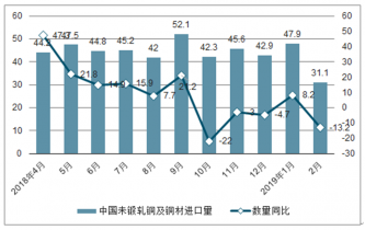 在進口金額方面,2018年2-4季度中國未鍛軋銅及銅材進口金額逐漸下降,2019年2月中國未鍛軋銅及銅材進口金額為2031.2百萬美元,同比下降29.7%。