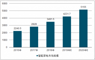 2017年,智能冰箱、空調(diào)、洗衣機市場規(guī)模為831.3億元,智能影音數(shù)碼(智能電視、智能音箱)市場規(guī)模為1,472.6億元,預計中國智能家電市場將保持穩(wěn)定增長,2020年市場規(guī)模將達到5,155.0億元。