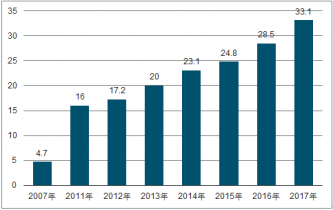 2007-2017年全球基因測序儀市場規(guī)模(億美元)