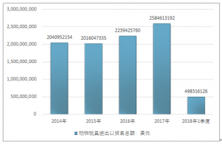 2016年我國動物玩具進出口貿易總額2239425760美元,2017年進出口貿易總額2584613192美元;2019年1季度進出口貿易總額498316126美元。