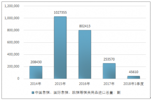 2016年我國中國象棋、國際象棋、跳棋等棋類用品進(jìn)口總量802413副 ,2017年進(jìn)口總量253570副 ;2019年1季度進(jìn)口總量45610副 。