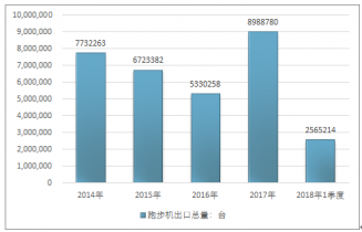 2016年我國(guó)跑步機(jī)出口總量5330258臺(tái) ,2017年出口總量8988780臺(tái) ;2019年1季度出口總量2565214臺(tái) 。