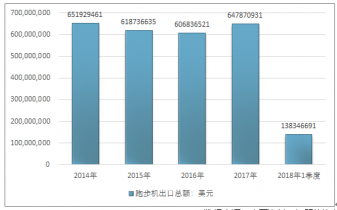 2016年我國(guó)跑步機(jī)出口總額606836521美元,2017年出口總額647870931美元;2019年1季度出口總額138346691美元。