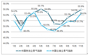 2019年1-4月,倉儲物流行業景氣指數增長態勢明顯。其中,受春節因素影響,2月份景氣指數落入收縮區間;但隨著節后生產經營活動的恢復,一直到4月份行業都處于擴張區間的高位水平。而在經歷了高峰后行業景氣度連續多月都有明顯滑坡,這主要受高溫多雨的季節性回落影響。隨后,自8月起隨著營商環境改善,“金九銀十”及中秋國慶、雙十一等節點影響,傳統旺季來臨,連續四個月保持在擴張區間,倉儲物流行業整體運行良好,行業景氣度持續回升,預計短期內的行業需求預期仍較為樂觀。