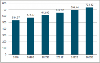 2018-2023年櫥柜行業銷售收入預測(億元)