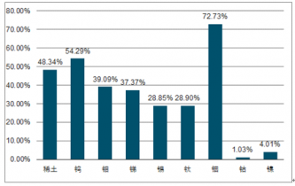 在儲量方面,根據金屬資源占全球比例來看,我國大部分小金屬占全球比重均超過20%。其中,稀土儲量5500萬噸,占比48.34%;鎢儲量190萬噸,占比54.29%;鉬儲量430萬噸,占比39.09%;銻儲量79萬噸,占比37.37%;錫儲量150萬噸,占比28.85%;鈦儲量2萬噸,占比28.90%;銦儲量0.8萬噸,占比72.73%;鈷儲量7.2萬噸,占比僅約1%;鎳儲量260.9萬噸,占比約4%。