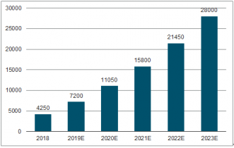2018-2023年食品行業(yè)電商交易規(guī)模預(yù)測(cè)圖(億元)