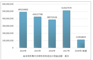 2016年我國全地形高爾夫球機動車進出口貿(mào)易總額385723126美元,2017年進出口貿(mào)易總額513527579美元;2019年1季度進出口貿(mào)易總額113918625美元。