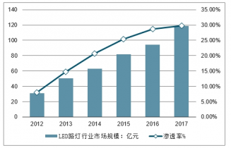 2012-2017年中國(guó)LED路燈行業(yè)市場(chǎng)規(guī)模及滲透率走勢(shì)