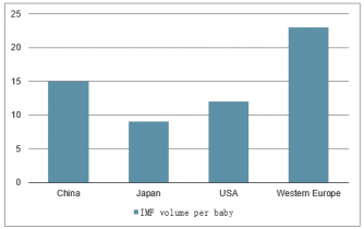 與其他國家相比,中國嬰兒配方奶的滲透率不算很低 每位嬰兒的消費量