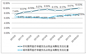 近幾年,我國城市居民的醫療保健支出和農村居民醫療保健支出占比呈上升趨勢。2018年第.一季度,我國城市和農村居民醫療保健支出占比分別為10.03%和7.5%。