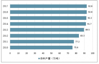2010年至2019年,我國染料產量從75.6萬噸上升至99.19萬噸,保持著穩步增長的態勢;2016年、2019年全年染料產量分別為92.8萬噸、99萬噸。預計2019年中國染料產量將超100萬噸,達到了100.1萬噸。