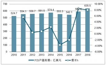 2010-2018年全球PCB產值規模統計及增長情況預測