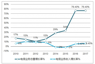 2010-2017年中國電信業(yè)務(wù)總量及收入增長(zhǎng)走勢(shì)