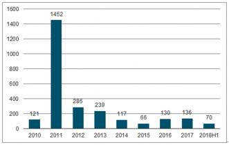 2010-2018年全國地方政府投融資平臺退出數量
