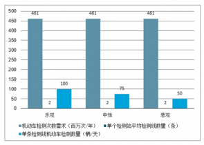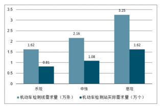由于我國機動車檢測行業發展時間較短,機動車檢測市場的發展遠滯后于汽車保有量增長。伴隨著我國汽車保有量的高速增長,機動車檢測市場增速將遠大于汽車保有量增速。根據《機動車環保檢驗機構發展規 劃編制工作指南》規定,按簡易工況法檢測線檢測量每年為 1-2 萬輛。假如按照 1.5 萬輛/年測算,每條線對應 52.8 輛次/天檢測次數。假設每條檢測線每天可檢測輛次悲觀、中性、樂觀分別對應 50/75/100 輛次,測算我國機動車檢測線需求量為 1.62-3.25 萬條,機動車檢測站 理論需求量 0.81-1.62 萬個。