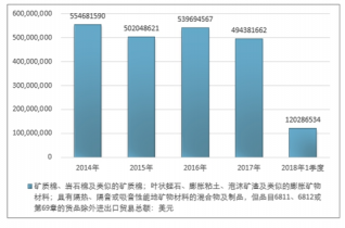 2016年我國礦質棉、巖石棉及類似的礦質棉;葉狀蛭石、膨脹粘土、泡沫礦渣及類似的膨脹礦物材料;具有隔熱、隔音或吸音性能地礦物材料的混合物及制品,但品目6811、6812或第69章的貨品除外進出口貿易總額539694567美元,2017年進出口貿易總額494381662美元;2018年1季度進出口貿易總額120286534美元。